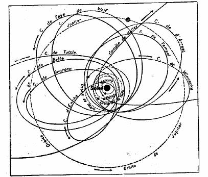 Toutes les comètes qui gravitent autour du Soleil décrivent des orbites analogues, plus ou moins allongées, ellipses dont l’astre radieux occupe un des foyers. Elles sont nombreuses. Le dessin que l’on voit ensuite donne une idée des intersections qu’elles offrent avec l’orbite de la Terre autour du Soleil et les autres orbites planétaires. En examinant ces intersections, on devine qu’une rencontre n’ait rien d’impossible ni même d’anormal.