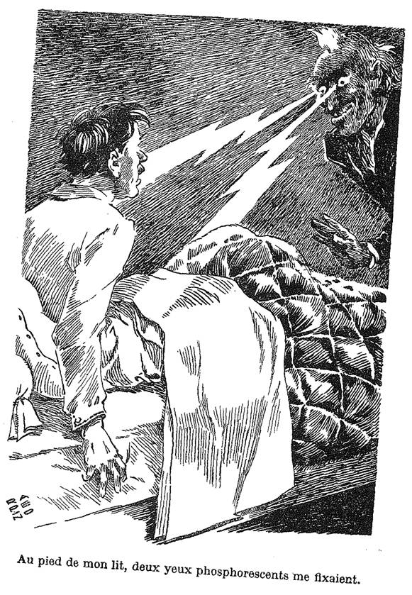 Au pied de mon lit… dans l’obscurité… deux yeux me fixaient… deux yeux phosphorescents qui me parurent énormes.