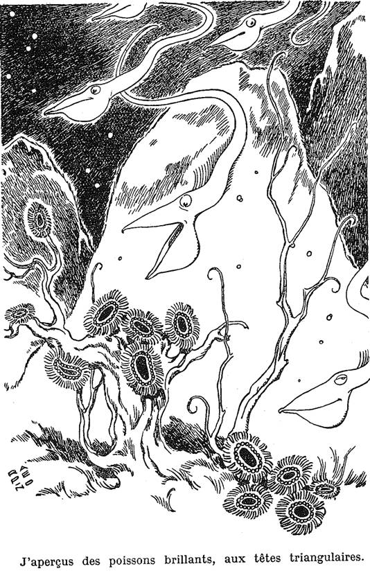 Les Mégalocéphales nous regardaient avec inquiétude… tout d’abord, ils rirent de nos extravagances, mais quand ils eurent aperçu le point noir qui provoquait notre enthousiasme, ils disparurent rapidement.