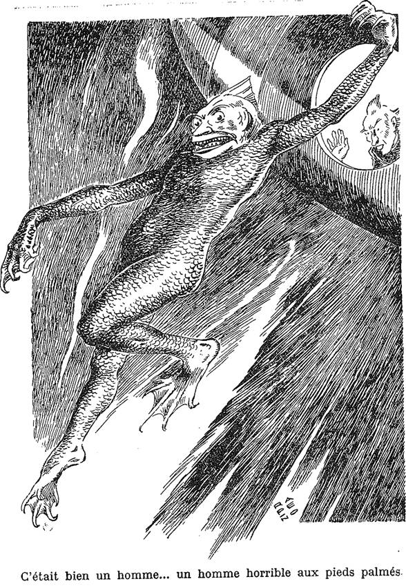 Un être diabolique, un monstre à l’air féroce, était à quelques pas de moi. Il ricanait en me fixant, et une houppe de cheveux blancs semblable à une aigrette se dressait et s’agitait sur son crâne luisant…