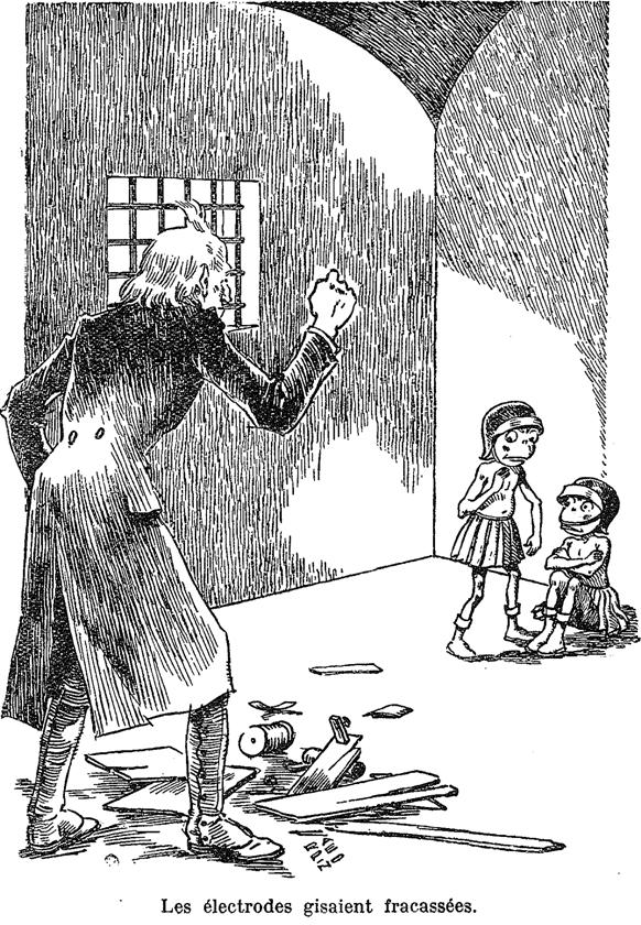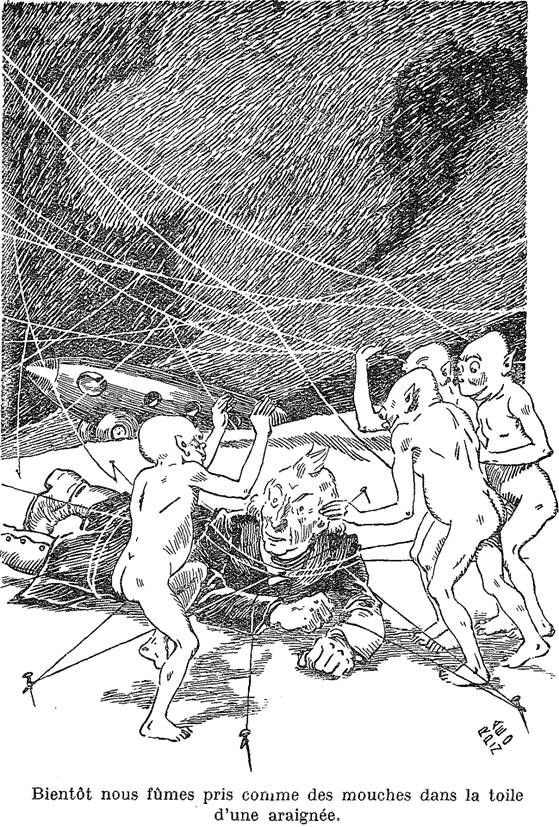 Je ne puis me rappeler sans un frisson de bonheur cette délicieuse rencontre qui mit en notre présence le docteur Helvétius et ses compagnons Blacwell et Somerson… Du coup, je lâchai les Martiens pour me précipiter dans les bras de nos sauveteurs et les Mégalocéphales se seraient certainement enfuis… si le docteur ne les avait rattrapés aussitôt… Pauvres petits êtres… leur destinée devait s’accomplir !…