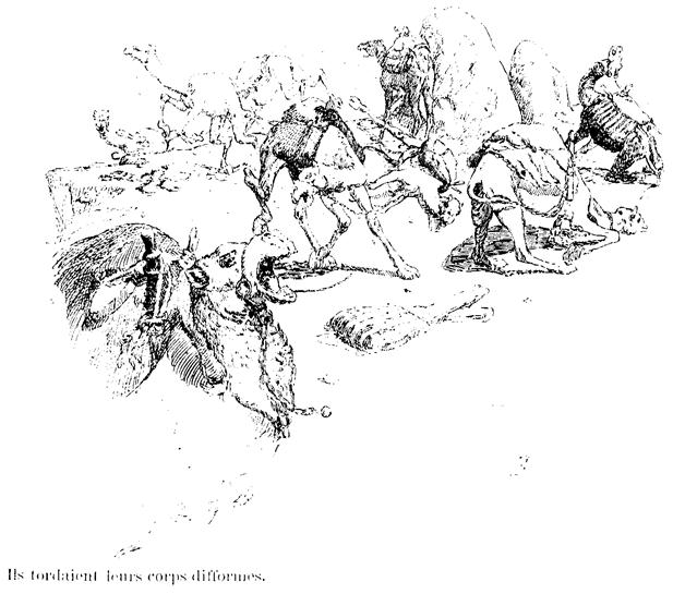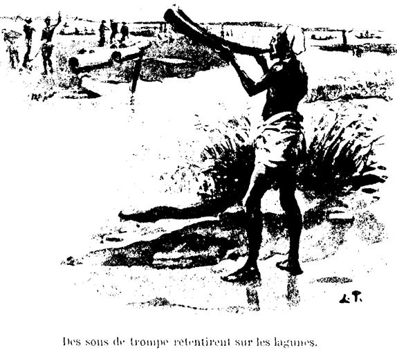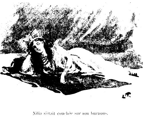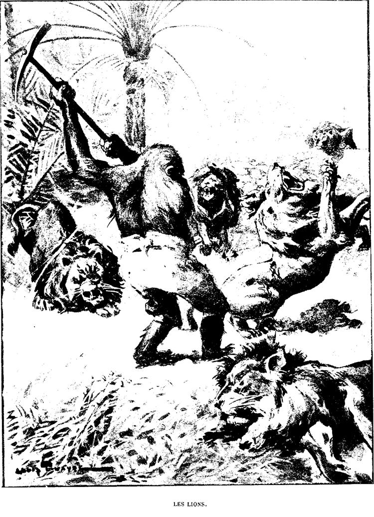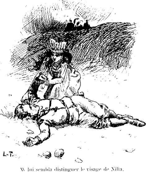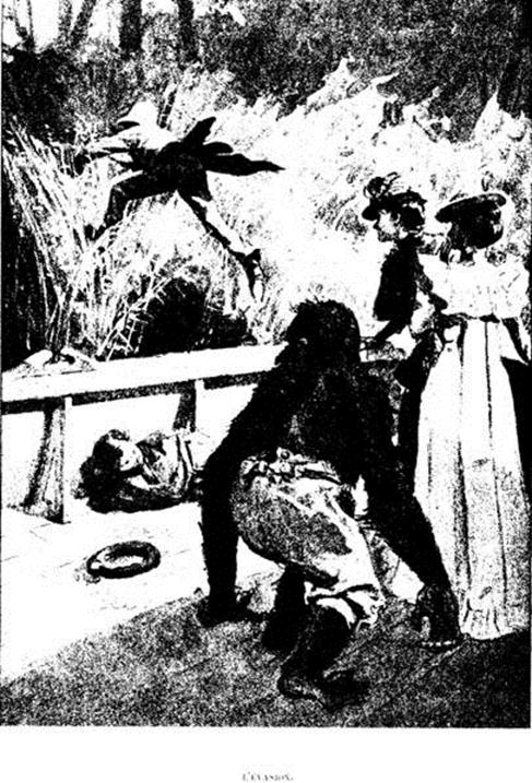 » J’aurais dû m’évanouir devant un tel spectacle. Pas du tout, il semble que l’horreur de la situation stimule mon courage. Je franchis le cadavre d’un bond, je cours à la cabane, j’entre. La première pièce est vide, je la traverse… Dans la seconde, j’aperçois un lit d’enfant, dont l’épaisse moustiquaire est fermée. Je m’arrête un instant, je n’ose soulever l’étoffe qui me cache la couche. Que verrai-je, si je regarde ? Mon petit Jean, car il se nommait Jean, est-il mort comme Oriemi, comme tous ceux que j’ai rencontrés sur la route ? Peut-être,… mais peut-être aussi, il vit. Je pourrais l’emporter dans mes bras, le sauver… J’étends la main vers l’étoffe ; d’un geste brusque j’écarte le frêle obstacle, et je reste interdite, stupéfaite !