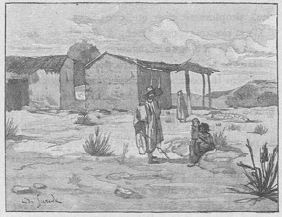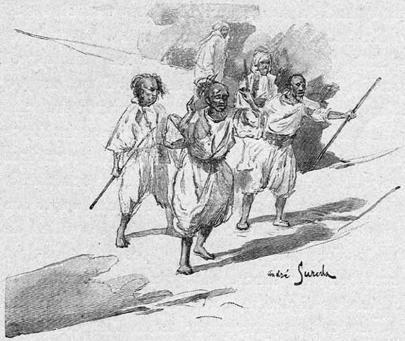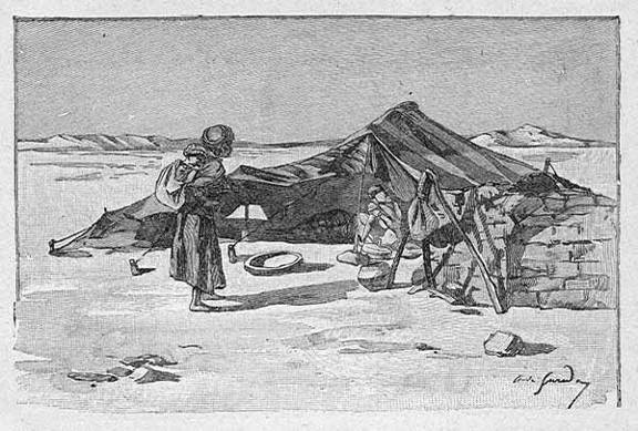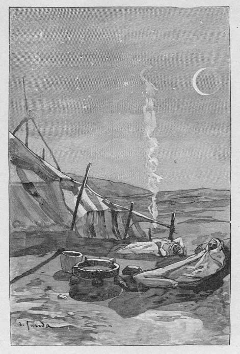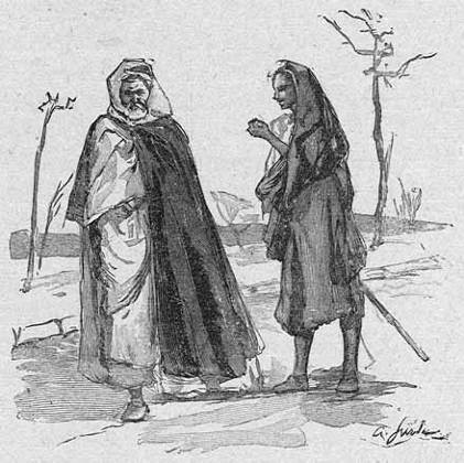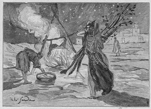 De temps en temps, des campements d’indigènes. On les découvre à peine, ces douars, auprès d’un torrent desséché où des enfants font paître quelques chèvres, quelques moutons ou quelques vaches (paître semble infiniment dérisoire). Les huttes de toile brune, entourées de broussailles sèches, se confondent avec la couleur monotone de la terre. Sur le remblai de la ligne un homme à la peau noire, à la jambe nue, nerveuse et sans mollets, enveloppé de haillons blanchâtres, contemple gravement la bête de fer qui roule devant lui. Plus loin c’est une troupe de nomades en marche. La caravane s’avance dans la poussière, laissant un nuage derrière elle. Les femmes et les enfants sont montés sur des ânes ou de petits chevaux ; et quelques cavaliers marchent gravement en tête, d’une allure infiniment noble.
