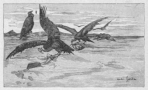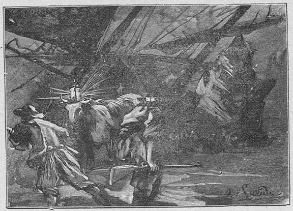 L’un d’eux, l’Abd-el-Kader, se met tout à coup à pousser des mugissements, car le sifflet n’existe plus ; il est remplacé par une sorte de cri de bête, une voix formidable qui sort du ventre fumant du monstre.