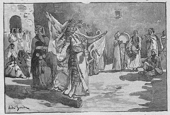 J’ai vu quelques jours après mon arrivée un bal en plein air à Mustapha. C’était la fête de Neuilly. Des boutiques de pain d’épice, des tirs, des loteries, le jeu des poupées et des couteaux, des somnambules, des femmes-silures, et des calicots dansant avec des demoiselles de magasin les vrais quadrilles de Bullier, tandis que derrière l’enceinte où l’on payait pour entrer, dans la plaine large et sablonneuse du champ de manœuvres, des centaines d’Arabes, couchés, sous la lune, immobiles en leurs loques blanches, écoutaient gravement les refrains des chahuts sautés par les Français.
