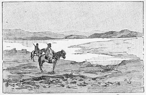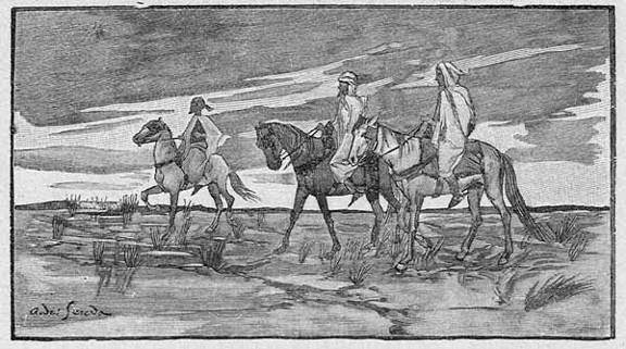 Puis, dans l’étendue de terre stérile et poudreuse on distingue, si loin qu’on la voit à peine, une sorte de fumée, un nuage mince qui monte vers le ciel et semble courir sur le sol. C’est un cavalier qui soulève, sous les pieds de son cheval, la poussière fine et brûlante. Et chacune de ces nuées sur la plaine indique un homme dont on finit par distinguer le burnous clair presque imperceptible.