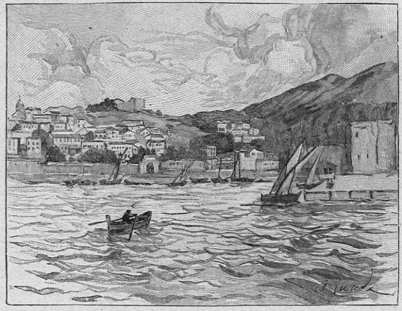 Ce qui en fait le charme et la grâce, c’est son golfe. Elle est assise tout au fond et semble regarder la douce et longue ligne des côtes, onduleuses, arrondies toujours en des courbes charmantes, et dont les crêtes lointaines sont noyées en ces brumes blanches et bleues, légères et transparentes que dégage la mer.